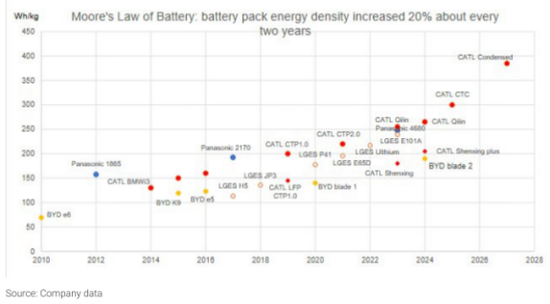 报告特别指出:“电池有自己的摩尔定律”,即:能量密度每两年提升20%以上。宁德时代的研发体系,正是围绕这个规律构建的系统性升级路径。