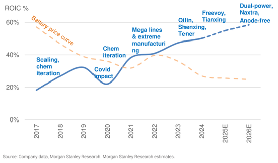 而摩根士丹利明确指出,宁德时代的商业模型是由“提高回报的技术升级”所驱动的。