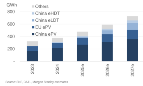宁德时代2025-27年的电动汽车电池量预测-24%的复合年增长率