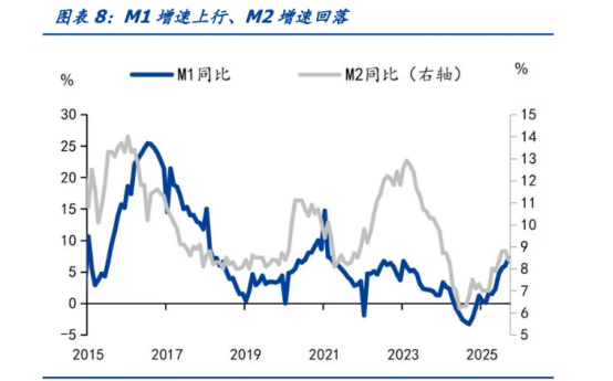 基数效应与居民存款回流推升M1增速,M2增速走低。9月M1同比增速延续回升,同比从6.0%大幅上行至7.2%,一方面是由于低基数因素所致,去年9月M1增速较8月下降0.3个百分点至-3.3%;另一方面,可能与居民存款回流有关,由于9月股市回流存款可能不会完全转化为定期存款,或带来活期存款增加推升了M1增速。从两年复合增速来看,9月M1两年复合增速为1.82%,较上月增速上行0.44个百分点,与年初的1.83%基本持平,后续走势有待继续观察。9月M2同比录得8.4%,增速较上月下行0.4个百分点。